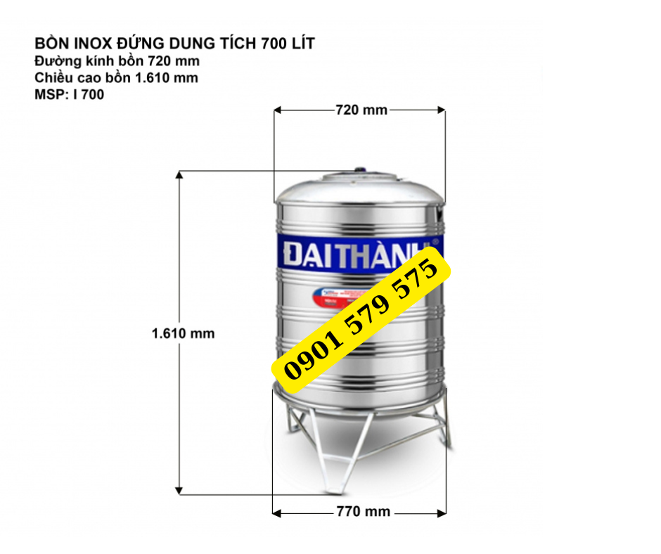 Kích Thước Bồn Nhựa 700L Đứng Đại Thành Inox 304