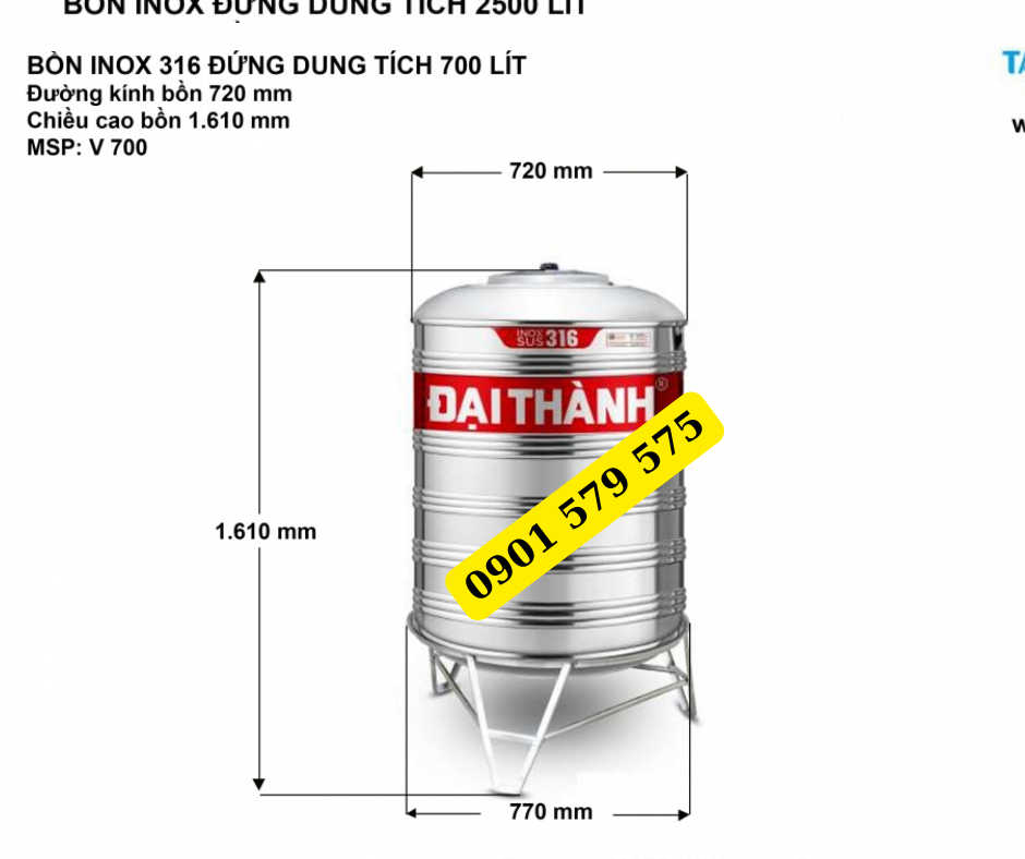 Bồn 700L Đứng Đại Thành Inox 316 Tại HCM