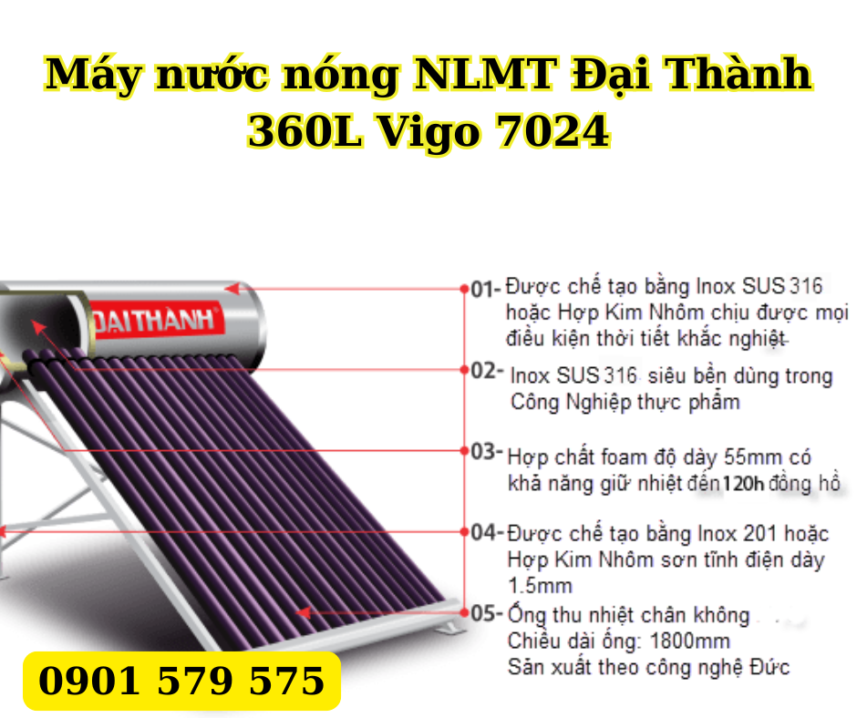 Đặc điểm nổi bật của máy nước nóng năng lượng mặt trời Đại Thành 360L Vigo 7024